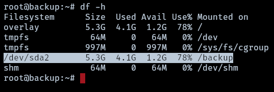 After obtaining root access in the backup container, it was observed using df -h that a portion of /dev/sda2, specifically /backup, is mounted within the container. This suggests that /dev/sda2 likely corresponds to the primary machines